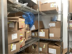 Multiple open boxes of food in the walk-in freezer